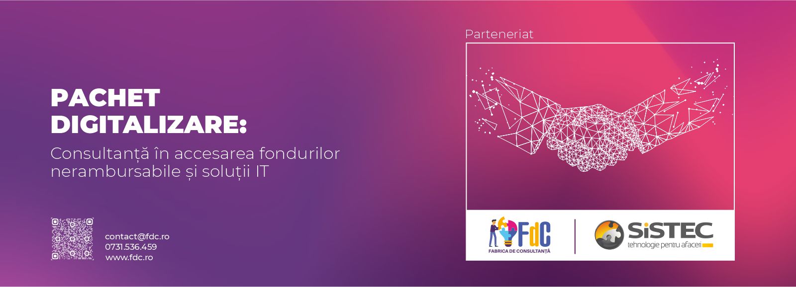Fabrica de Consultanță, în parteneriat cu Sistec, vă oferă soluții complete pentru digitalizarea afacerii cu fonduri nerambursabile: consultanță în accesarea fondurilor nerambursabile și soluții IT personalizate. Poți accesa maxim 100.000 Euro nerambursabili prin programul Digitalizare I...