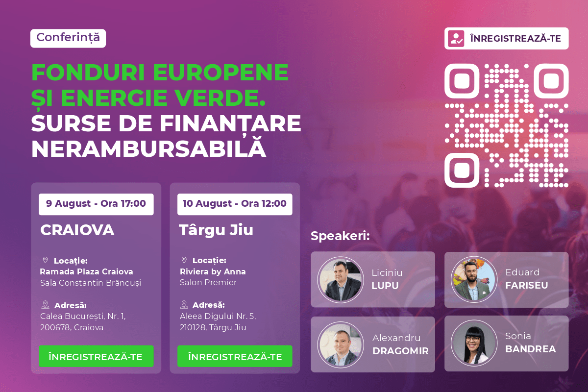 Firmele din zona Olteniei pot afla în doar câteva ore cum pot accesa fonduri europene pentru producerea de energie regenerabilă și ce programe cu finanțare nerambursabilă pot accesa anul acesta. Antreprenorii și oamenii de afaceri din județele Dolj, Gorj, Olt, Vâlcea și Mehedinți sunt inv...