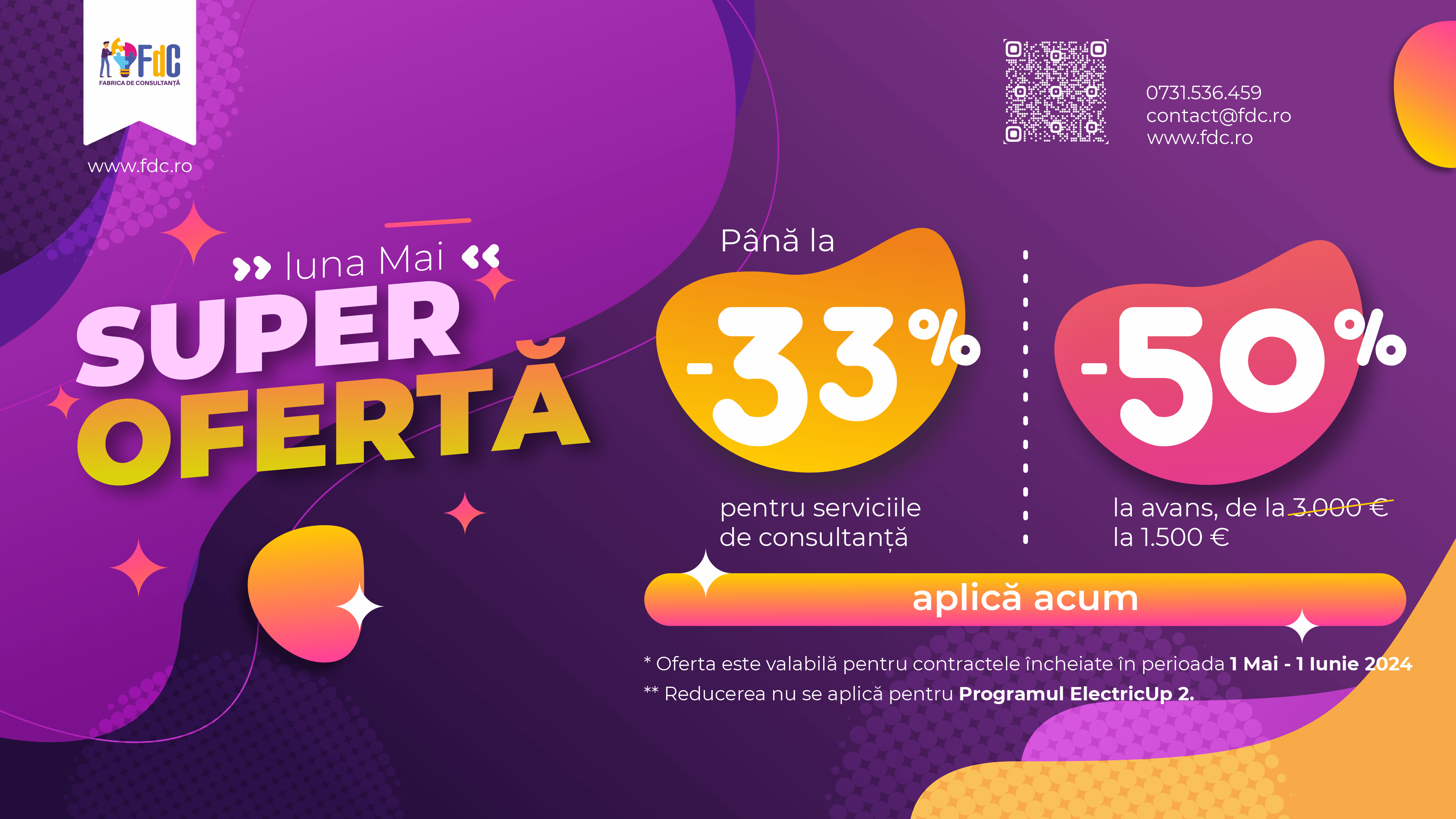 Nu ai reuÈ™it să ne contactezi în luna Aprilie pentru oferta specială?Nu îți face griji. Am prelungit oferta, astfel încât să poÈ›i beneficia de reduceri È™i luna aceasta. Astfel, pentru orice contract de consultanță încheiat în luna Mai, beneficiezi de:📌 REDUCERE de până la –...