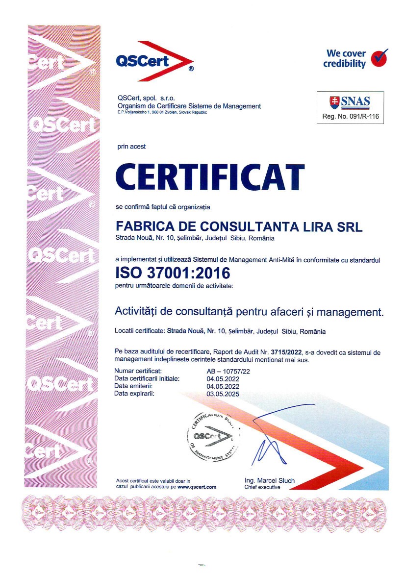Fabrica de Consultanță a implementat și utilizează Sistemul de Management Anti-Mită în conformitate cu standardul ISO 37001: 2016. Acest standard internațional reflectă bunele practici internaţionale anti-mită și este conceput să ajute o organizaţie să prevină, să detecteze şi să combată mita şi să se conformeze legilor anti-corupție şi angajamentelor voluntare aplicabile activităţilor acesteia.